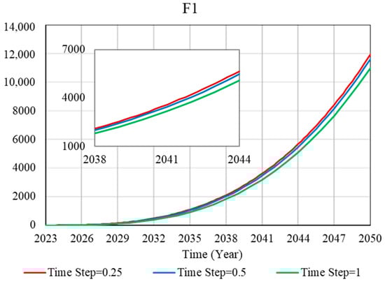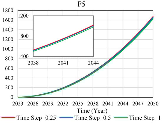 The stability test is to study the development trend of the curve in different situations and the stability of the fitting situation under different situation settings. The subsystem of BIM and new-generation information technology integration (F1) and the subsystem of the reality of the construction process (F5) are tested. Three different step sizes are set for them, namely 0.25, 0.5, and 1. The time unit of the test is the year, and the time interval starts from 2023 to 2050. The development trends of the two subsystems at different step lengths are highly consistent, indicating that the system has good stability (as shown in Figure 7).