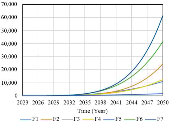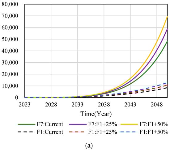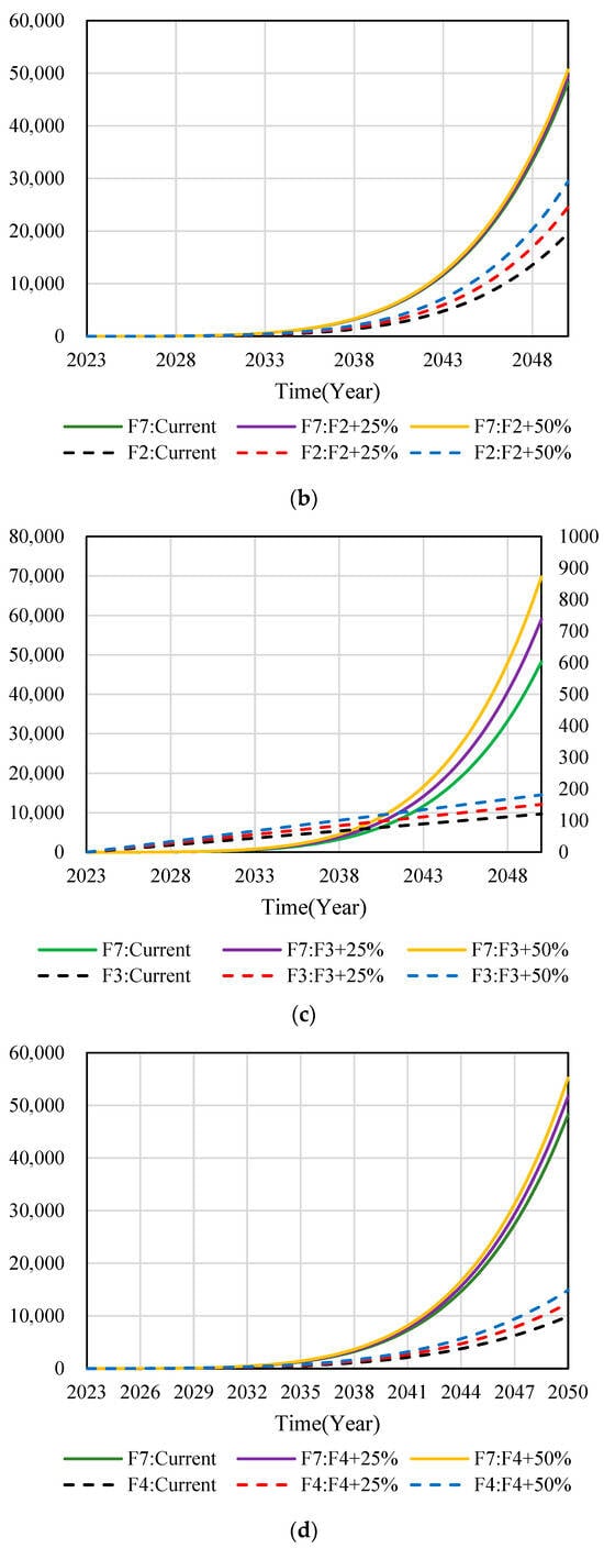 From the evolution of the dotted curves in Figure 9a,b,d,f after improving F1, F2, F4 and F6 subsystems by 25% and 50%, it is found that their predicted development trends are consistent, and the corresponding effect value increases with the enhancement of the subsystem. At the same time, it can be seen from the evolution law of the solid line curve that the adjusted F1, F2, F4, and F6 subsystem models maintain a similar growth pattern between 2023 and 2038. However, with the evolution of time between 2038 and 2050, the effect value of the subsystem also changed greatly, indicating that F1, F2, F4, and F6 subsystems all have important influences on the SD model of F7.