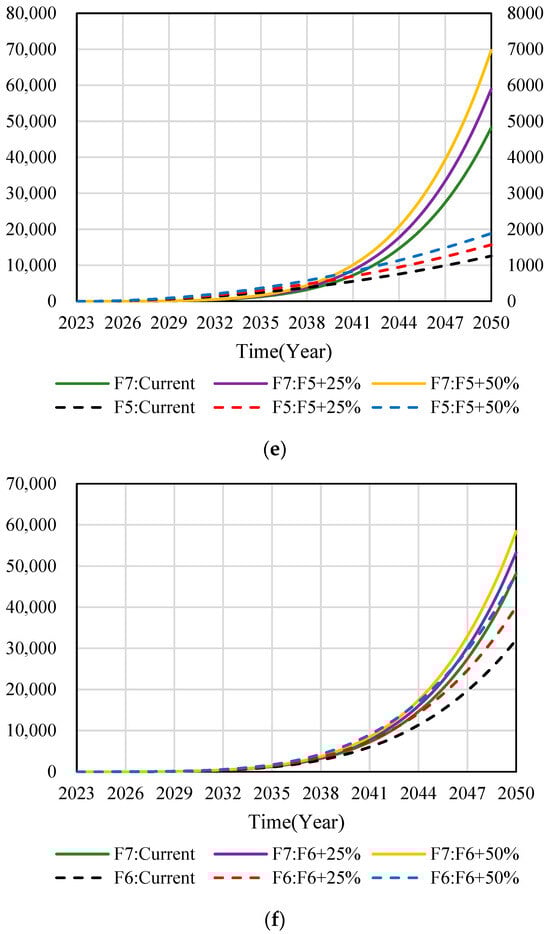 The dotted and solid curves in Figure 9c,e correspond to the left and right ordinate axes, respectively. From the development law of the dotted curves in Figure 9c,e, after improving the F3 and F5 subsystems by 25% and 50%, it is found that their predicted development trends are consistent, and with the enhancement of subsystems, the corresponding effect value increases, approximately showing a linear growth trend. At the same time, it can be seen from the development law of the solid line curve that the adjusted F3 and F5 subsystem models maintain a similar growth law between 2023 and 2041. However, with the evolution of time between 2041 and 2050, the effect value of the subsystem also changed greatly, indicating that both F3 and F5 subsystems have important influences on the SD model of F7.