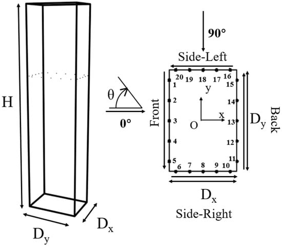 To verify the reliability of building wind tunnel tests and numerical simulation techniques, often the CAARC standard high-rise building model is commonly used for wind load study in structural wind engineering, with a dimension of 30.48 m × 45.72 m × 182.88 m (Dx × Dy × H). Currently, multiple wind tunnel testing institutions have conducted wind tunnel tests on this model and have established a relatively uniform testing standard and a large amount of building wind pressure test results. Thus, the CAARC model is used for verifying the accuracy and precision of the LBM–LES method in this paper. For surface pressure measurement tests of the CAARC rigid model [29], the pressure measurement points at a height of 2/3H on the building are arranged and the position of measurement points and a diagram of multiple wind direction angles are depicted in Figure 1. The incoming wind is defined as perpendicular to the Front surface, where the 1–5 measurement points of the CAARC model are located, with a wind direction angle of 0°. By rotating the building model clockwise, different wind direction angles are set for the calculation conditions, gradually increasing from 0° to 90° with an interval of 15°.
