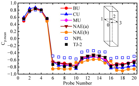 Figure 2 summarizes the distribution of the mean wind pressure coefficients at 2/3 height of CAARC building under a 0-degree wind direction angle from different institutions [29]. It can be observed from Figure 2 that the mean wind pressure coefficients submitted by different institutions show a generally consistent trend, but the average deviation is as high as 15%, especially in the negative pressure areas on both sides and the back of the CAARC standard building. When comparing the results of the NPL and TJ-2 wind tunnel experiments at Tongji University, it is found that the absolute value of negative pressure simulated by NPL is significantly smaller. This may be attributed to the fact that the turbulence intensity of atmospheric wind field simulated by NPL is relatively low. In addition, differences in the model scaling ratios used by different institutions may also contribute to the deviations in wind pressure test results.