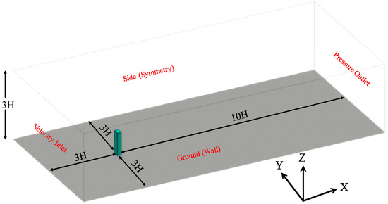 An LBM numerical model based on XFlow software (version 2020x) was established for the CAARC standard rectangular building. The overall computational domain size is shown in Figure 3. The building model size is the same as the wind tunnel test, with a scale ratio of 1:300. Referencing the research by Wijesooriya (2021), the height of overall computational domain is 3 × H and the side boundaries located 3 × H away from the target building. The windward face of CAARC building is 3 × H away from the inlet boundary, while the leeward face of building is 10 × H from the outlet boundary to avoid the re-circulation phenomenon. The building model blockage rate is less than 3% and the computational requirements for general building numerical wind tunnels are satisfied.