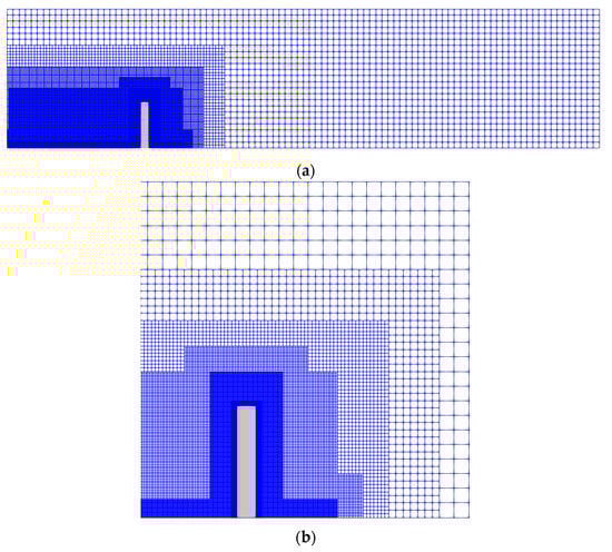 The mesh generation strategy is mainly divided into three steps: background mesh generation of computational domain, building surface refinement, and refinement region mesh setting. The schematic diagram of building surface mesh generation is shown in Figure 4. Firstly, the basic grid size of global computational domain is set as 0.08 m (dx). Secondly, the near-wall refinement approach is adopted over building surface with a minimum grid size of 1/32 × dx set. The grid resolution within the computation domain is increased gradually from the building surface to the boundary of the computational domain by a factor of two, thus forming a multi-scale octree grid structure. Finally, a local cuboid region is set up for the more refined resolution of wind flow fields around buildings. A rectangular refinement region with the dimension of 4H × H × 1.2H (length × width × height) is used. Additionally, the grid is further refined with a grid size of 1/16 × dx = 0.005 m within a height range of 0.1 m to capture the near-wall turbulence flow around the building.
