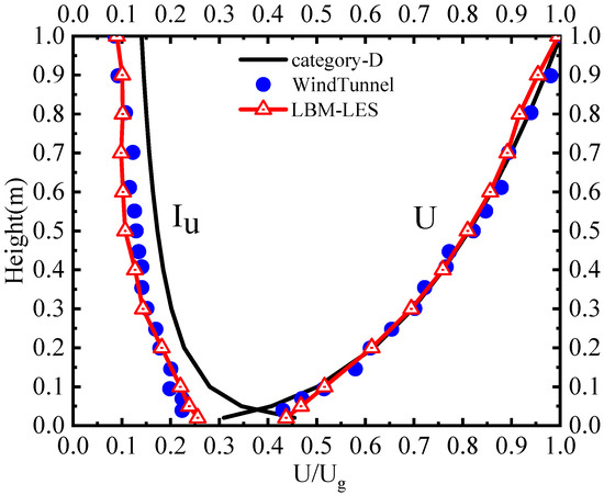 This article mainly refers to the wind pressure test results of the CAARC rigid model conducted at Tongji University in China [29]. The actual length of the wind tunnel test section is 15 m, the width is 3 m, and the height is 2.5 m. In the test, a passive method was used to simulate the flow field, with a tower turbulence generator and distributed rough elements used to simulate the velocity and turbulence intensity distribution of the atmospheric boundary layer. The model scale ratio was selected as 1/300, and the wind tunnel test blockage ratio was 1.3%. Given the limited research on the simulation of strong turbulence conditions at D-category roughness landscape according to the Chinese Load Code for Design of Building Structures [30], the LBM–LES simulation method was verified through the comparison with Tongji University’s TJ-2 wind tunnel experiments.