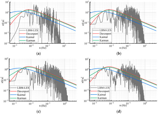 The simulated wind spectrum at different inflow positions at 2/3 height of the computational domain is shown in Figure 7. It shows that the LBM–LES simulated wind spectrum matches well with the commonly recommended wind spectrum in wind engineering, although the high-frequency components of the wind spectrum decay rapidly due to the grid filtering effect. In the later stage, the simulation accuracy of high-frequency wind speeds can be improved by increasing the grid resolution. Overall, LBM–LES adopted in the paper can reproduce the incoming wind field characteristics consistent with wind tunnel experiments reasonably.