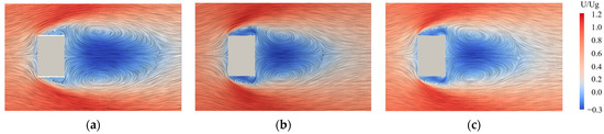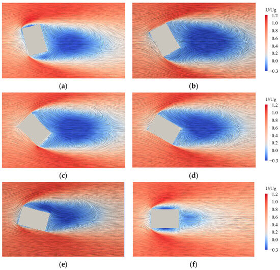 It can be observed from Figure 8b and Figure 12f that there is significant flow separation on both sides of the CAARC building under 0-degree and 90-degree wind directions. The flow separation occurs at the sharp edges on both sides of the building, and the separated flow does not reattach. A comparison of the flow fields in the wake region of the building under the two conditions further reveals that the range of the wake vortex in the 0-degree wind direction case is significantly larger. From 0- to 15-degree wind direction (see Figure 12a), the flow structures around the building becomes more complex, with asymmetric flow separation on both sides of the building and a larger re-circulation structure developing in the central area of the upper side of the building, indicating worse negative pressure conditions. It can also be found that the separation and reattachment phenomena around the building become more complex as the wind direction angle changes. A comparison of Figure 12d,e reveals that a local re-circulation and reattachment flow structure appears on the windward front of the long side of the CAARC building under a 75-degree wind direction, while there is no significant separation phenomenon under 60-degree wind direction. This indicates significant differences in wind pressure at this location, and often requires a more refined grid resolution scale for accurate wind flow simulation.