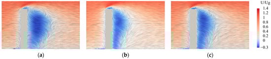 As shown in Figure 9, both the basic grid and fine grid schemes successfully reproduced the reverse flow structure at the top of the building, while the coarse grid scheme failed to simulate this phenomenon. Furthermore, the cavity behind the building reproduced by coarse grid scheme had a tendency to move away from the walls of the building to a certain extent, while the latter two schemes showed a similar cavity phenomena. It was also found that the coarse grid scheme had a larger velocity recirculation zone and larger vortex scales at the rear of the building, while a smaller vortex scale resolved in other two grid schemes.
