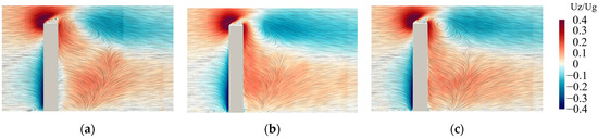 Normalized vertical-component wind speed in the middle vertical section (y/H = 0). (a) Coarse grid; (b) basic grid; (c) fine grid.
