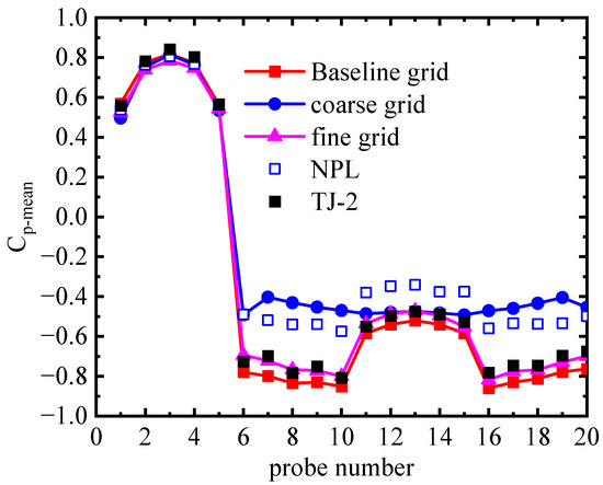 The comparison of mean wind pressure coefficients from three grid resolutions under a 0-degree wind direction are given in Figure 11. The simulated mean wind pressure coefficients on the windward side of the building by three grid schemes are consistent with the wind tunnel test, but the coarse grid scheme significantly underestimates the negative wind pressure on the building’s two-side areas. The mean negative wind pressure coefficients simulated by the basic grid and fine grid are basically consistent with the TJ-2 wind tunnel test, indicating that the simulation results are not dependent on the grid resolution.