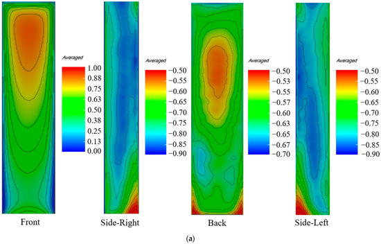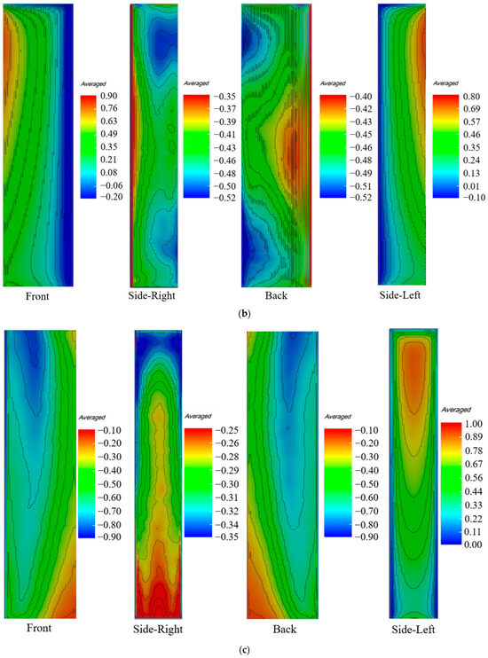 Figure 13 presents the simulated mean wind pressure coefficient contour of the CAARC standard building model under different wind direction angle conditions. Comparing the mean wind pressure coefficient maps in Figure 13a with the particle image velocimetry test from Yu [32], the mean wind pressure distributions from LBM–LES are in good agreement with the data from the wind tunnel test, except that those on the sidewall from LBM–LES simulations are slightly larger than that from the wind tunnel test. As shown in Figure 13a, the simulated mean wind pressures on the building surface under 0 degrees exhibit a clearly symmetric distribution. The windward face is mainly subject to positive pressure, with a maximum wind pressure coefficient of 0.82. The negative pressure on both sides of the building is symmetrically distributed and reaches its most unfavorable condition, while the pressure on the back of the building is relatively small. Under the influence of a 90-degree wind direction (see Figure 13c), the left side (Side-Left) of the building is the actual windward face. The wind pressure on both the Front and Back faces of the building is mainly negative, with the maximum value occurring at a local position on the top of the building. The mean wind pressure on the actual leeward face, i.e., Side-Right, is relatively small. As shown in Figure 13b, the distribution of wind pressure on the building surface becomes more complex and uneven under a 45-degree wind direction. The symmetry of the wind pressure distribution on the building surface disappears, and the maximum average negative pressure occurs at the intersection edge between the Side-Right and Back faces.