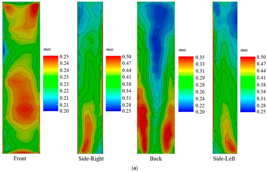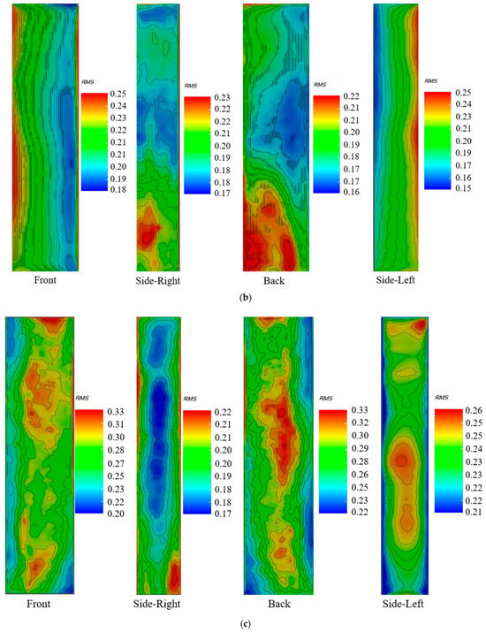Figure 14 further presents the contours of fluctuating wind pressure coefficients on the surface of the CAARC building under three wind direction angle calculation conditions (0, 45, and 90 degrees). Comparing the fluctuating wind pressure coefficient contour maps in Figure 14a with the experimental results of Yu [32], it can be seen that, although there are significant differences between the windward fluctuating wind pressure distribution simulated by LBM–LES and the wind tunnel test, the leeward and sidewall simulation results are relatively close to the experimental distribution, and the simulation error is smaller compared to the existing traditional finite volume method. As shown in Figure 14a, the simulated fluctuating wind pressure coefficients on the left and right sides of the CAARC standard building exhibit symmetric distribution, with the maximum value occurring in the lower part of the building’s leeward face. Under 45-degree and 90-degree wind directions, the symmetry is not obvious, and the fluctuating wind pressure distributions are influenced by the turbulence of the incoming flow and the building shape itself.