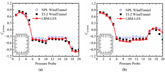 Considering that the turbulence intensity of the NPL wind tunnel test was relatively low, resulting in a smaller simulated mean wind pressure, while the LBM–LES and TJ-2 wind tunnel tests showed good agreement, further comparisons were made based on the TJ-2 results. The maximum and minimum mean wind pressure coefficients simulated by LBM–LES were then compared and summarized with the wind tunnel test results and given in Table 5. The relative error of the maximum wind pressure coefficient between LBM–LES simulation and TJ-2 wind tunnel test are generally within 15%, except for individual cases such as the CFD simulation result error being relatively large under a 45-degree wind direction.
