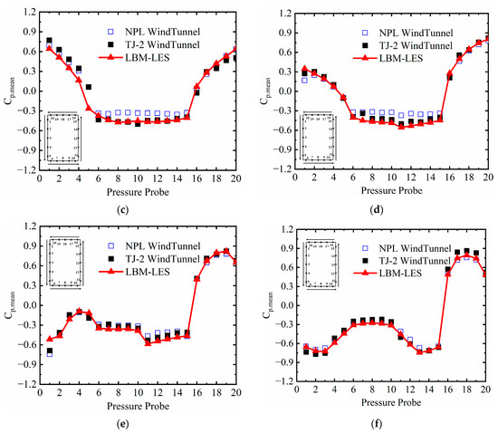 Comparison of mean wind pressure coefficients simulated by LBM–LES with wind tunnel experiments under different wind direction angle conditions. (a) 15 degree; (b) 30 degree; (c) 45 degree; (d) 60 degree; (e) 75 degree; (f) 90 degree.