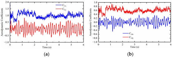 Taking the 0-degree wind angle case as an example, Figure 16 shows the time-series aerodynamic force and base moment coefficients of a CAARC building. It can be observed that building mainly experiences significant aerodynamic coefficients in the x direction and bending moment coefficients in the y direction, while the x-direction bending moment and y-direction aerodynamic forces fluctuate around zero, which is consistent with the periodical wake vortex phenomenon observed in the wind flows of CAARC building.