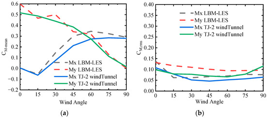 To quantitatively analyze the errors simulated by LBM–LES, Table 6 further summarizes the error results of the base bending moment simulated by LBM–LES relative to the TJ-2 wind tunnel experiment. The percentage in the table represents the relative errors. It can be seen that LBM–LES simulation results generally matched well with the experimental data of TJ-2 wind tunnel, while the X-direction mean bending moment coefficients are overestimated with an average relative error of 28.05%. At a 30-degree wind direction angle, the relative error of the simulated CMx is 97% compared to the TJ-2 experiment value of 0.07. The Y-direction mean bending moment coefficient has a relatively small error, except only a relative error of 93.46% at a 90-degree wind direction angle. When considering the standard deviation of bending moment coefficient, it can be seen that the simulated results of LBM–LES are generally overestimated, with significant differences in the Y-direction bending moment coefficient. Overall, this analysis demonstrates the effectiveness and reliability of LBM–LES in calculating building wind loads. The standard deviation of bending moment coefficient simulation results is significantly affected by the incoming turbulence fluctuations in the LBM model.