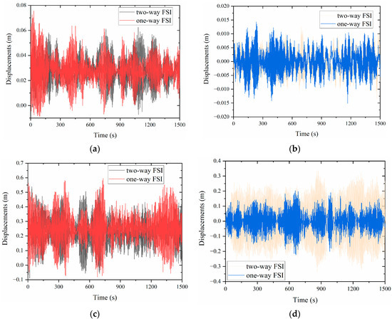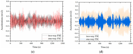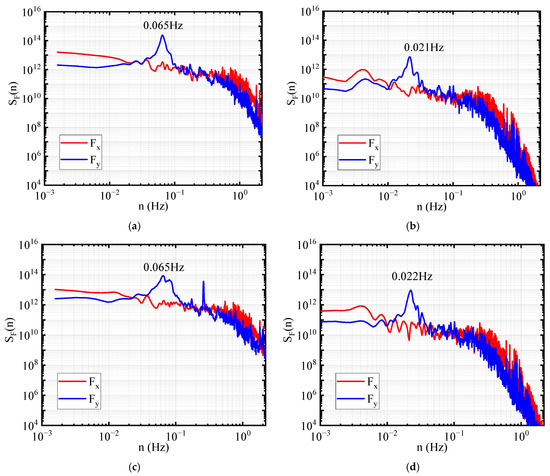 Power spectral density of aerodynamic forces at two different reduced velocities. (a) One-way FSI (); (b) one-way FSI (); (c) two-way FSI (); (d) two-way FSI ().
