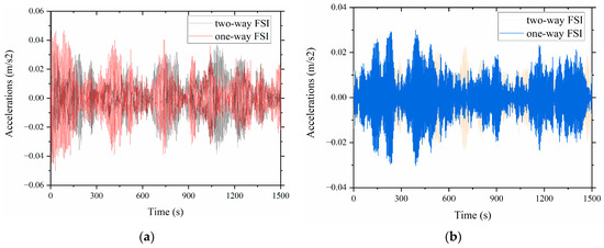 The structural analysis was conducted in ABAQUS using an implicit dynamic step. For the one-way FSI model, a step frequency larger than ten times the natural frequency (0.173 Hz) of the structure was required to capture high-order vibrations. In contrast, the two-way FSI model was solved every 2 × 10−3 s (500 Hz) to maintain synchronization with the CFD simulation, with data stored at a frequency of 50 Hz. To facilitate comparison between the one-way and two-way FSI methods, a step size of 2 × 10−3 s was used for both analyses. The simulations for both types of FSI were run for a total flow time of 1800 s, with data recorded only during the last 1500 s to allow the simulations to stabilize during the initial 300 s. The chosen time step of 2 × 10−3 s was sufficient to achieve convergence.