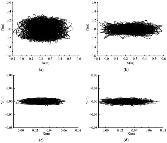 Top node trajectory of CAARC building model at two different reduced velocities. (a) two-way FSI; (b) one-way FSI; (c) two-way FSI; (d) one-way FSI.