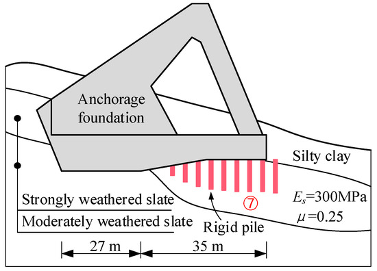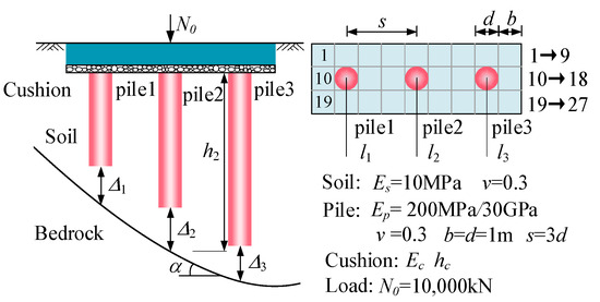 - Jiang, K.; Gong, W.; Xu, J.; Dai, G.; Guo, X. Effects of inclined bedrock on dissimilar pile composite foundation under vertical loading. Geomech. Eng. 2022, 31, 477–488. [Google Scholar]