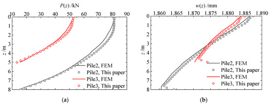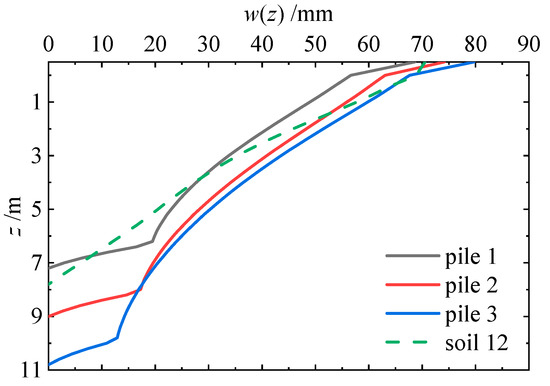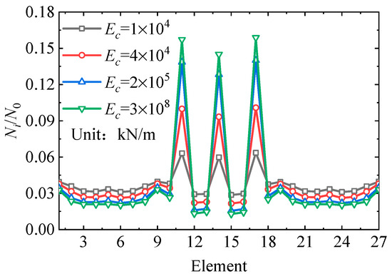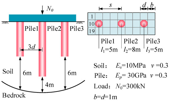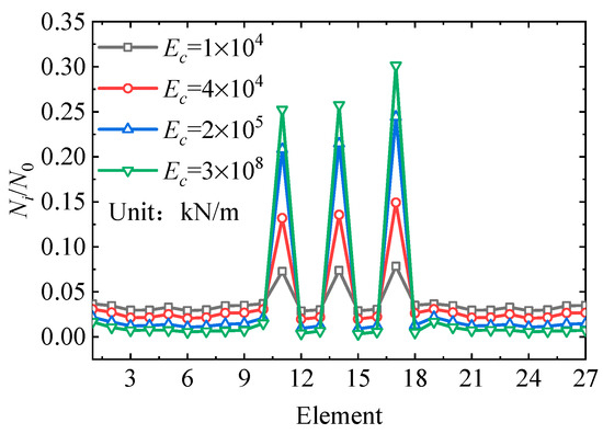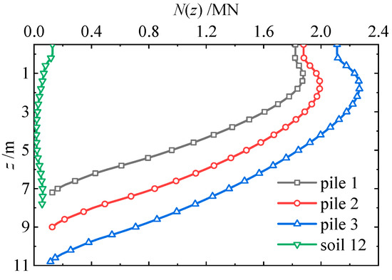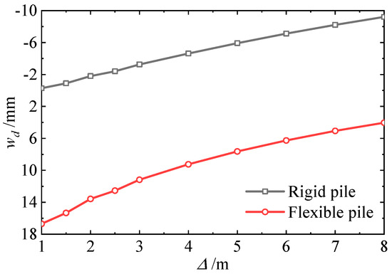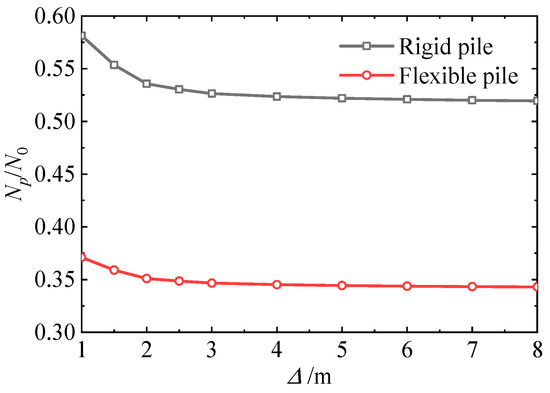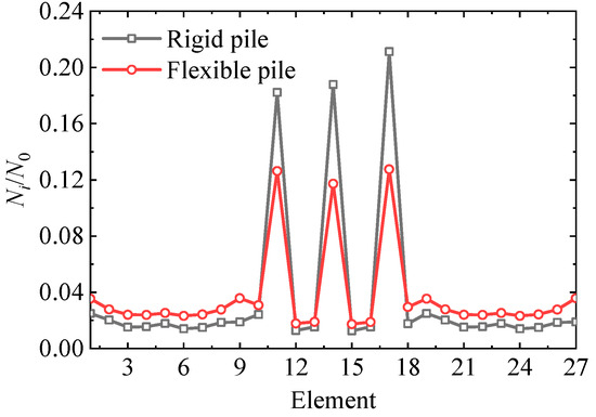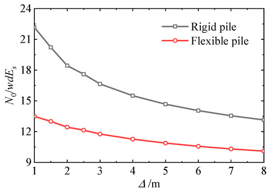 - For rigid pile conditions, rigid piles exhibit significant vertical stiffness and a strong load transfer ability. The factor of the pile length plays a controlling role in the PCF’s behaviors. Therefore, regarding the axial force of the pile shaft, the N0/wdEs of the PCF increases with l/d, and the displacement mode of the piles is characterized as rigid body settlement. For the flexible pile condition, the LSR of the piles and the N0/wdEs of the PCF are affected by the pile length and the distance from the pile bottom to bedrock Δ. Due to the relatively weaker load transfer ability of piles, the compression of the pile shaft cannot be ignored. The vertical rigidity of piles has a significant influence on the load distribution and settlement behaviors of the PCF.