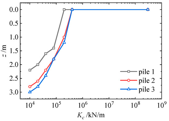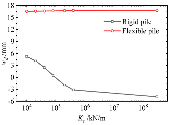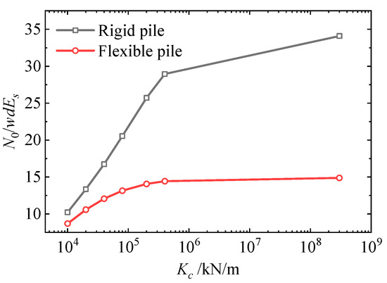 - The depth of the neutral layer of piles decreases with an increase in the cushion stiffness. The neutral layer depth of the pile for the rigid pile condition is larger than that for the flexible pile condition when considering the same cushion stiffness. Additionally, the LSRs of the piles Ni/N0 and the N0/wdEs of the PCF increase with Kc, and the average settlement and differential settlement of the rigid foundation decrease with Kc.