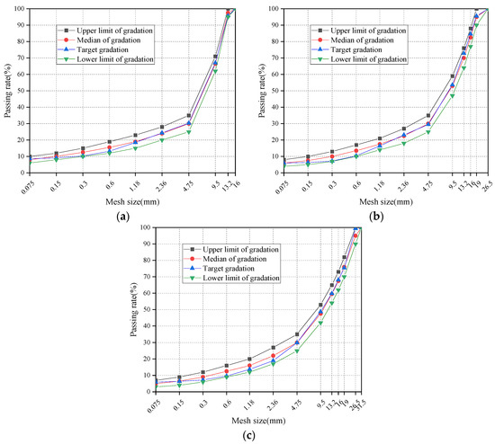 Asphalt mixture mineral grading curve: (a) ARHM-13; (b) ARHM-20; (c) ARHM-25.
