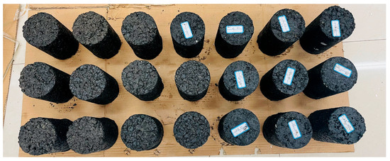 The limestone aggregate is placed in a constant-temperature oven at 110 °C until it reaches a consistent weight through drying. The asphalt and aggregate are heated in the oven at 180 °C for over 2 h, following the grading mentioned above design. The crumb rubber-modified asphalt mixture is thoroughly mixed using an indoor mixer, maintaining the optimal oil-to-stone ratio. Specimens were prepared using the rotating compaction method (76-B0252 rotating compactor of Italian CONTROLS). After demudding, cylindrical specimens with a height of 150 mm and a diameter of 100 mm were obtained. The asphalt mixture specimens are shown in Figure 3.