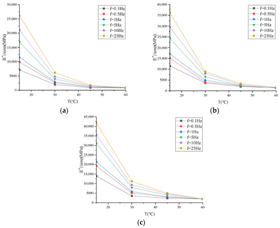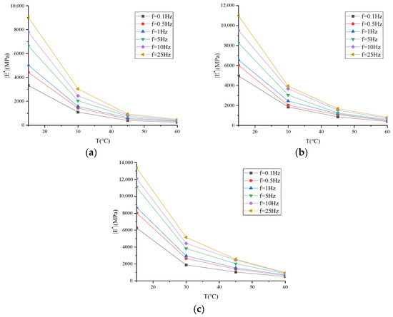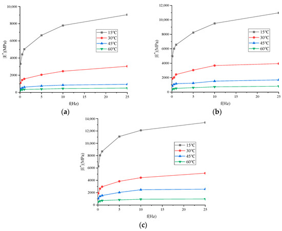 The dynamic modulus changes with temperature for the three different crumb rubber-modified asphalt mixtures at different frequencies are shown in Figure 10.
