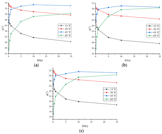As shown in Figure 5, when the temperature is between 15 °C and 30 °C, the phase angle of the three crumb rubber-modified asphalt mixtures decreases with the increase in loading frequency, and the decreasing trend gradually slows down with the growth of loading frequency. When the temperature is between 45 °C and 60 °C, the phase angle of the three kinds of rubber-modified asphalt mixtures increases with the increase in loading frequency, and the decreasing trend gradually slows down with the increase in loading frequency. The phase angle is stable when the frequency increases beyond a certain threshold. The phase angle characterizes the ability of the mixture to resist deformation under load from the perspective of viscosity, reflecting the proportion and degree of influence of viscosity and elastic components in viscoelasticity. Under the conditions of 15 °C and 30 °C, the phase angle decreases with the increase in loading frequency, and the decreasing trend gradually slows down. The formation mechanism of high-temperature stability of asphalt mixtures comes from the bonding properties of the binder and the interlocking effect of mineral aggregate gradation. Under low temperatures and high-frequency loads, the primary performance is elastic. With the increase in loading frequency, the elastic performance is enhanced, resulting in a decrease in phase angle. As the loading frequency increases, the elastic performance tends to stabilize to a certain extent, and the ratio of the elastic part to the viscous part tends to stabilize.