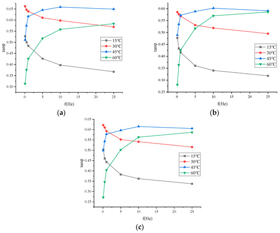 As shown in Figure 8, when the temperature is between 15 °C and 30 °C, the loss factors of the three crumb rubber-modified asphalt mixtures decrease with the increase in loading frequency, and the decreasing trend gradually slows down with the growth of loading frequency. When the temperature is between 45 °C and 60 °C, the loss factors of the three kinds of rubber-modified asphalt mixtures increase with the increase in loading frequency, and the decreasing trend becomes slower with the growth of loading frequency. The variation pattern of the loss factor with loading frequency aligns with the phase angles. The loss factor is the tangent of the phase angle between the strain and stress period of a viscoelastic material under the action of an alternating force field, which is also equal to the ratio of the loss modulus to the storage modulus of the material. When the temperature is between 45 °C and 60 °C, the loss factor can be calculated from the phase angle obtained from the test.