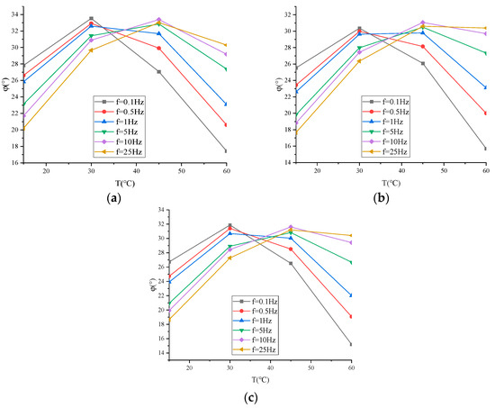 Variation trend of phase angle of asphalt mixtures with loading frequency: (a) ARHM-13; (b) ARHM-20; (c) ARHM-25.