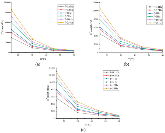 Under four temperature conditions and different frequency conditions, the storage modulus results for three different kinds of rubber-modified asphalt mixture are shown in Figure 18.