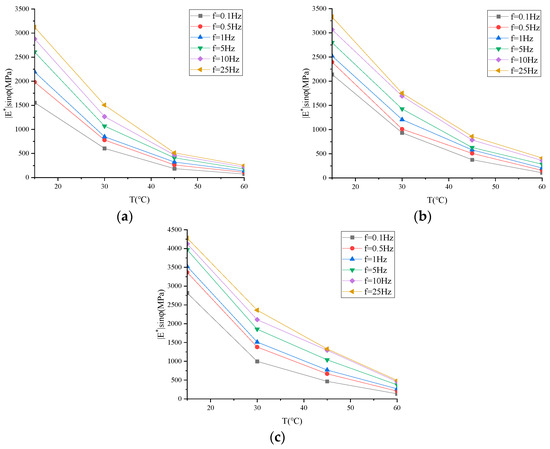 The loss modulus changes with the loading frequency of three different crumb rubber-modified asphalt mixtures under different temperature conditions are shown in Figure 7.