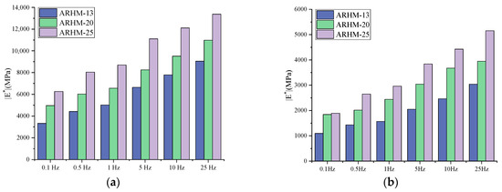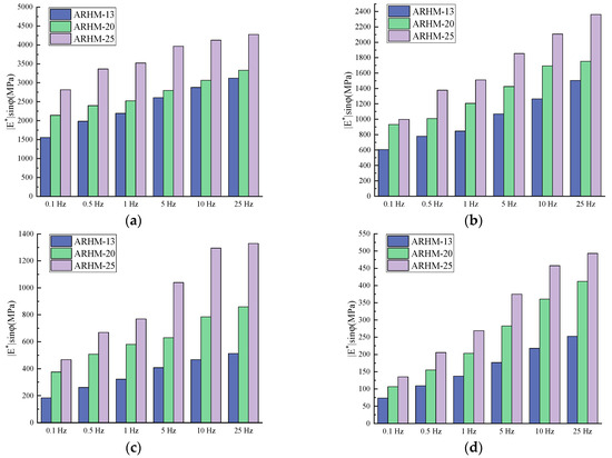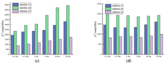 As can be seen from Figure 16, under different temperature and frequency conditions, the dynamic modulus results for the three different kinds of rubber-modified asphalt mixtures are as follows: ARHM-25 > ARHM-20 > ARHM-13. The experimental results show that as the maximum nominal particle size of the gradation increases, the dynamic modulus of the asphalt mixture is significantly enhanced. Therefore, it is recommended to use coarse-grained asphalt mixture as pavement material in areas and sections with heavy traffic and high temperatures.
