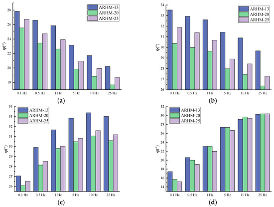 As can be seen from Figure 17, under the condition of T ≤ 45 °C and different frequencies, the phase angle results for the three different kinds of rubber-modified asphalt mixture are as follows: ARHM-13 > ARHM-25 > ARHM-20. Under the conditions of T = 60 °C and f ≤ 5 Hz, the phase angle results for the three different kinds of rubber-modified asphalt mixture are as follows: ARHM-13 > ARHM-20 > ARHM-25. Under the condition of T = 60 °C and f = 10 Hz, the phase angle results for the three different kinds of rubber-modified asphalt mixture are as follows: ARHM-20 > ARHM-25 > ARHM-13. Under the conditions of T = 60 °C and f = 25 Hz, the phase angle results for the three different kinds of rubber-modified asphalt mixture are as follows: ARHM-25 > ARHM-20 > ARHM-13.
