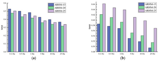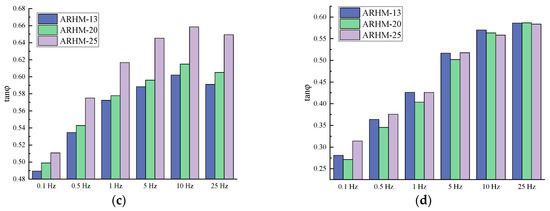 As can be seen from Figure 20, under the condition of T = 15 °C and different frequencies, the loss factors of the three different kinds of rubber-modified asphalt mixture are as follows: ARHM-13 > ARHM-25 > ARHM-20. Under the condition of T = 30 °C or 45 °C and different frequencies, the loss factors of the three different kinds of rubber-modified asphalt mixtures are as follows: ARHM-25 > ARHM-20 > ARHM-13. Under T = 60 °C and f ≤ 0.5 Hz, the loss factors of the three different kinds of rubber-modified asphalt mixtures are as follows: ARHM-25 > ARHM-13 > ARHM-20. Under T = 60 °C, f = 1 Hz, the loss factors of the three different kinds of rubber-modified asphalt mixtures are as follows: ARHM-20 > ARHM-13 > ARHM-25. Under the condition of T = 60 °C, f = 10 Hz, the loss factors of the three different kinds of rubber-modified asphalt mixture are as follows: ARHM-20 > ARHM-25 > ARHM-13. Under T = 60 °C and f = 25 Hz, the loss factors of the three different kinds of rubber-modified asphalt mixtures are as follows: ARHM-20 > ARHM-13 > ARHM-25.