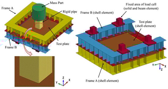 In the finite element model, the test plate, pipe, and connecting part were modeled with 10 × 10 mm shell elements. The mass component and load cells were represented using solid elements, with the maximum size of the solid elements being 20 mm. In the analytical models, the test plate, supporting frames A and B, and two load cells were integrated into a unified structure instead of being individually assembled with bolts and stoppers. The supporting frames were modeled with shell elements. The load cells were modeled with solid and beam elements. The models were fixed completely at the bottom of the load cells. The finite model is shown in Figure 3. MAT_24 (piecewise linear plasticity) is a commonly used elastic–plastic material model, and it is capable of characterizing the strain rate effect of materials using stress–strain curves or a function reflecting the influence of strain rate. The MAT_24 model was employed to simulate both the pipe and the test plate. The primary emphasis is on the deformation of the steel plate. Therefore, the mass part was modeled by the rigid material model. The supporting frames and the four load cells were modeled by the elastic material model. The Cowper–Symonds model was used to consider the strain rate effect of the steel. The material parameters of steel are presented in Table 2.