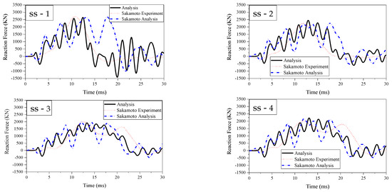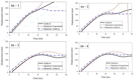 As shown in Figure 4, the perforation of the test plate occurred in the simulation and experiment results of both SS-1 and SS-2. Moreover, the test steel plate experienced significant deformation in the impact area without penetration in both the results of the SS-3 and SS-4 tests. Consequently, the predicted permanent deformations of the steel plate consistently matched the experimental observations. Figure 5 shows the impact force curves measured by the reaction force of the simulations and experiments. It was noted that the reaction force curves in the simulation results by Sakamoto exhibited higher frequency vibrations than those in the experiments. This could be attributed to the fixed boundary condition between the test plate and the supporting frame assumed in their model rather than the real situation in the experiments. Furthermore, the simulation results in this study demonstrated much better alignment with the experimental results than the analytical results of Sakamoto. The displacement curves of simulations and experiments are shown in Figure 6. In SS-1 and SS-2, the penetration of the test plate occurred in the impact area. It was observed that the simulation results were close to the experimental results. Moreover, the displacement curves in this study agreed better with the experimental results compared with the simulation results of Sakamoto. Table 3 compares the maximum reaction force, maximum displacement, and impact time of simulation with the experimental data. The maximum error of peak impact force, maximum displacement, and impact duration were 9.5%, 15.5%, and 7.2%, respectively. Based on these discussions, the reliability of the modeling techniques, material model, and failure criterion was confirmed. The difference between the airtight protective door and the tested plate may introduce uncertainty in fully guaranteeing the validation of the airtight protective door. However, both of them belong to the category of low-velocity impact problems. Maintaining consistency in mesh size and constitutive parameters during the numerical simulation process ensures that the accuracy meets the requirements of airtight protective door engineering.