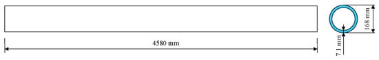 Regulatory Guide 1.76 specifies three types of tornado missiles, including the Schedule 40 pipe, automobile, and solid steel sphere to be used for the design of the exterior structure [31]. The Schedule 40 pipe was used as a penetrating missile, and the automobile was used as a massive, high-kinetic energy missile. The solid steel sphere could also pass through the openings in the protective barriers. The primary focus among these missiles is the Schedule 40 pipe due to its higher likelihood of penetrating the door panel. The impact velocity of the missiles was determined based on the maximum wind speed of the tornado. Figure 9 shows the schematic diagram of the Schedule 40 pipe. The mass of the Schedule 40 steel pipe was 130 kg. With a maximum wind speed of 116 m/s for the F4 tornado and assuming the plant is located in region I, the impact velocity of the Schedule 40 pipe, according to Regulatory Guide 1.76, is 41 m/s.