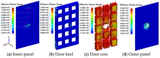 This section entails the numerical simulation of the airtight protective door under tornado pressure load and the impact of a Schedule 40 pipe. Subsequently, the performance of the airtight protective door was assessed. The effective plastic strain contours and damage on the door panels, door keel, and door core after impact were plotted in Figure 14. It was observed that the penetration occurred in the impact area of the outer door panel and door core. The plastic zone of the door keel predominantly existed at the impact and hinge positions, with a maximum effective plastic strain value of 0.11. Consequently, no fracture damage occurred at the door keel post-impact. The effective plastic strain of the inner door panel was concentrated in the impact area, with a maximum value of 0.09, significantly below the failure strain limit. Thus, the inner door panel had a certain degree of safety. These observations suggested that the tornado missiles could not penetrate the airtight protective door, thereby ensuring the safety of indoor personnel and equipment.