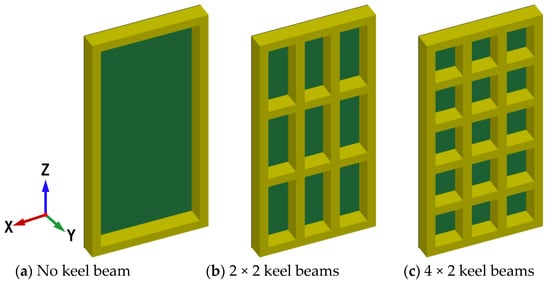 The design of an airtight protective door is significantly influenced by the number and arrangement of keel beams. Additionally, it is crucial to investigate the impact of the keel beams’ quantity and arrangement on the resistance of the airtight protective door. This section compares three types of airtight protective doors: one without a keel beam, another with 2 × 2 keel beams, and a third with 4 × 2 keel beams. Figure 19 illustrates the distribution of keel beams in the three types of airtight protective doors.