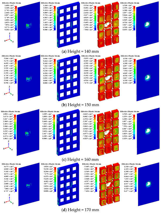 Figure 22 shows the effective plastic strain contours and damage on the airtight protective door with different section heights of the keel beam. The calculation results of the airtight protective door with different section heights of the keel beam subjected to tornado and pipe impact are presented in Table 8. It was observed that the results of the displacement, support rotations deformation, airtightness, and damage of the airtight protective door with different section heights of keel beams were close. This suggests that altering the section height of keel beams has minimal impact on impact resistance. Therefore, in designing an airtight protective door, the height of the keel beam can be reduced to enhance cost-effectiveness.