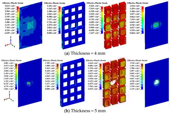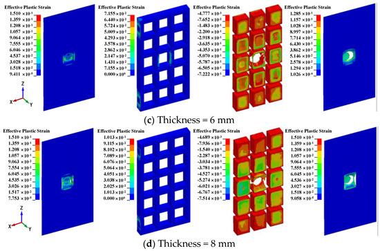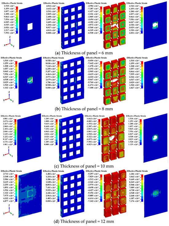To study the effect of different thicknesses of door panels, four airtight protective doors with door panel thicknesses of 6, 8, 10, and 12 mm are considered herein. Table 11 shows the results of the airtight protective door with different thicknesses of door panels subjected to tornado and missile impact. Effective plastic strain contours and damage on the airtight protective door with different thicknesses of the door panel are shown in Figure 25. It is evident that, as the door panel thickness increases, the maximum displacements of the inner door are 56.4, 55.3, 29.1, and 24.5 mm, respectively. As the thickness of the door panel increases, the maximum displacement and residual displacement of the inner door panel decrease gradually. Moreover, with the increase in the door panel thickness, the maximum displacements of the outer panels were very close to each other. From the results of the penetration for the panel, it is inferred that the smaller the thickness of the door panel, the more likely it is for penetration to occur at the door panel, and the airtightness is more likely to be destroyed. As the thickness of the door panel increases, the rotation angle changes slightly, and they all are within 2°. Hence, the design thickness of the door panel should be maintained within a specific range.