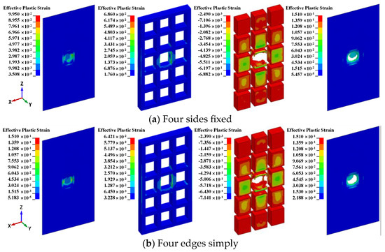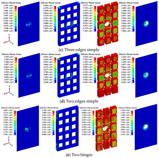 To study the influence of boundary conditions on the dynamic response of the airtight protective door subjected to the tornado missile, five airtight protective doors with different boundary conditions are considered in this section. Figure 26 shows the effective plastic strain contours and damage on the airtight protective door with different boundary conditions. The comparison of the results of displacement, support rotations deformation, airtightness of the door, and damage to the airtight protective door with different boundary conditions are presented in Table 12. It is observed that the results of the displacement and penetration of the door panel do not change with different boundary conditions. Thus, the boundary condition had little effect on the local response of the airtight protective door. Under the boundary condition of four sides fixed, four sides simply supported, three sides simply supported, and two opposite sides simply supported, the rotational deformations of the airtight protective door were 0.9°, 1.0°, 1.1°, and 1.2°, respectively. The variation in boundary conditions had a discernible impact on rotational deformation, affecting the overall deformation of the airtight protective door. The observations suggest that, as the number of constraints increases, the overall displacement of the airtight protection door decreases.