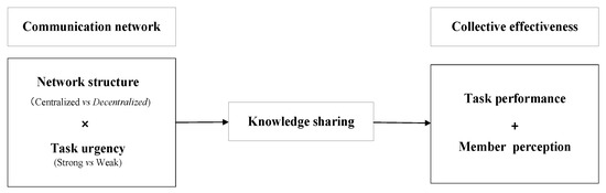 For the successful achievement of organizational goals, members of an organization endeavor to share and disseminate their unique information and knowledge to others, externalizing internal knowledge into collective knowledge that is owned, shared, and agreed upon by PBOs [53,54]. The aforementioned processes of knowledge acquisition, sharing, transfer, and integration largely depend on the communication structure. In recent years, social networks have been seen as channels for organizational learning, playing a role in information sharing and knowledge transfer [55,56,57]. For example, in a global PBO, we found that each member relies heavily on networks for acquiring knowledge, communication, and learning from others [58]. Thus, social networks can reveal patterns of knowledge integration [59]. In centralized networks, close ties and social cohesion among organization members who are geographically closer are more likely to facilitate knowledge transfer and learning among members [60]. On the other hand, decentralized networks, due to their heterogeneity of knowledge, can effectively enhance the effectiveness of shared knowledge [61,62].