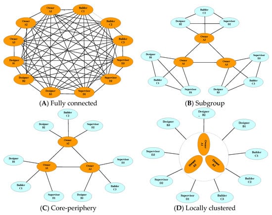 Drawing upon the existing research on communication networks of engineering project teams featured in mainstream peer-reviewed papers and case studies [32,33,34], this study summarizes four types of communication networks. These networks include the fully connected network, the subgroup network, the core-periphery network, and the locally clustered network. Referring to existing classification methods [10], the first two are classified as decentralized networks, while the latter two are considered centralized networks.