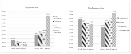 Next, the results of main effect test were completed (Figure 3). The fully connected network (M = 16.350, SD = 2.057) led to better task performance compared to the locally clustered network (M = 5.250, SD = 0.968, CI [9.987, 12.213], p < 0.001) and the core-periphery network (M = 6.250, SD = 1.089, CI [8.959, 11.240], p < 0.001) under the condition of weak task urgency. In addition, the fully connected network (M = 3.875, SD = 0.331) inspired more positive member perception compared to the core-periphery network (M = 3.000, SD = 0.408, CI [0.581, 1.169], p < 0.001) and the locally clustered network (M = 3.250, SD = 0.661, CI [0.262, 0.988], p < 0.001) under the condition of weak task urgency. Thus, H1a is validated.