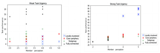 Furthermore, we found a positive correlation between task performance and member perception (Figure 4). That is to say, as the level of member perception increases, task performance shows an upward trend under various levels of task urgency. Additionally, under higher task urgency, for any given level of member perception, task performance is highest in a decentralized structure. In a decentralized network, members with the same level of perception tend to achieve higher task performance. However, under conditions of weaker task urgency, although decentralized networks can achieve better member perception, they do not necessarily have the highest task performance; conversely, centralized networks exhibit significant advantages in task performance. Thus, H2 is verified.