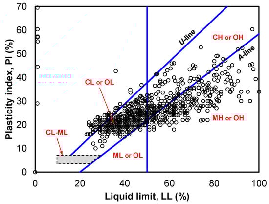 A total of 916 samples were used in order to assemble a dataset, which were provided by Ongun [39], Satyanarayana and Satyanarayana [40], Kahraman [41], and Kalantary and Kordnaeij [42]. Figure 2 presents 916 samples in the plasticity chart for soil classification. As shown in the figure, the model developed in this study is limited to the scope of the data. Therefore, it should be noted that the fine-grained soil in this study does not encompass all fine-grained soil; rather, it is confined to the data range shown in Figure 2.