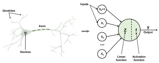 Compared to other AI algorithms, DL methods such as ANNs consistently deliver superior results. These networks have been developed with inspiration from the human brain, specifically the biological structures of neuron cells and neuron networks. In ANNs, these biological elements are expressed mathematically, with a neuron cell corresponding to a mathematical expression known as a perceptron. The NNs formed by biological neuron cells are represented as the output of many perceptrons, which serve as inputs to the subsequent perceptron [43] (see Figure 4).